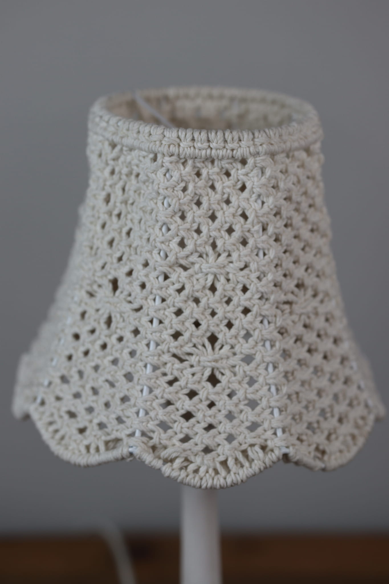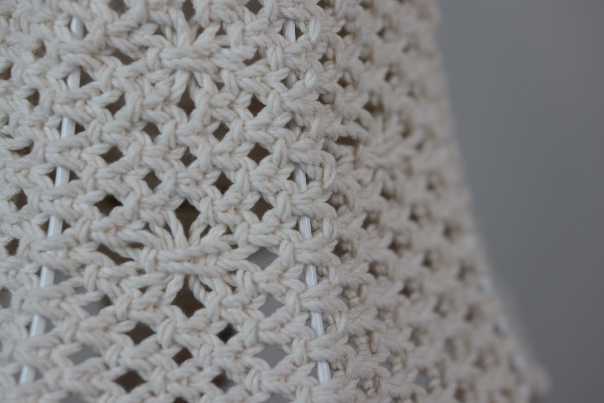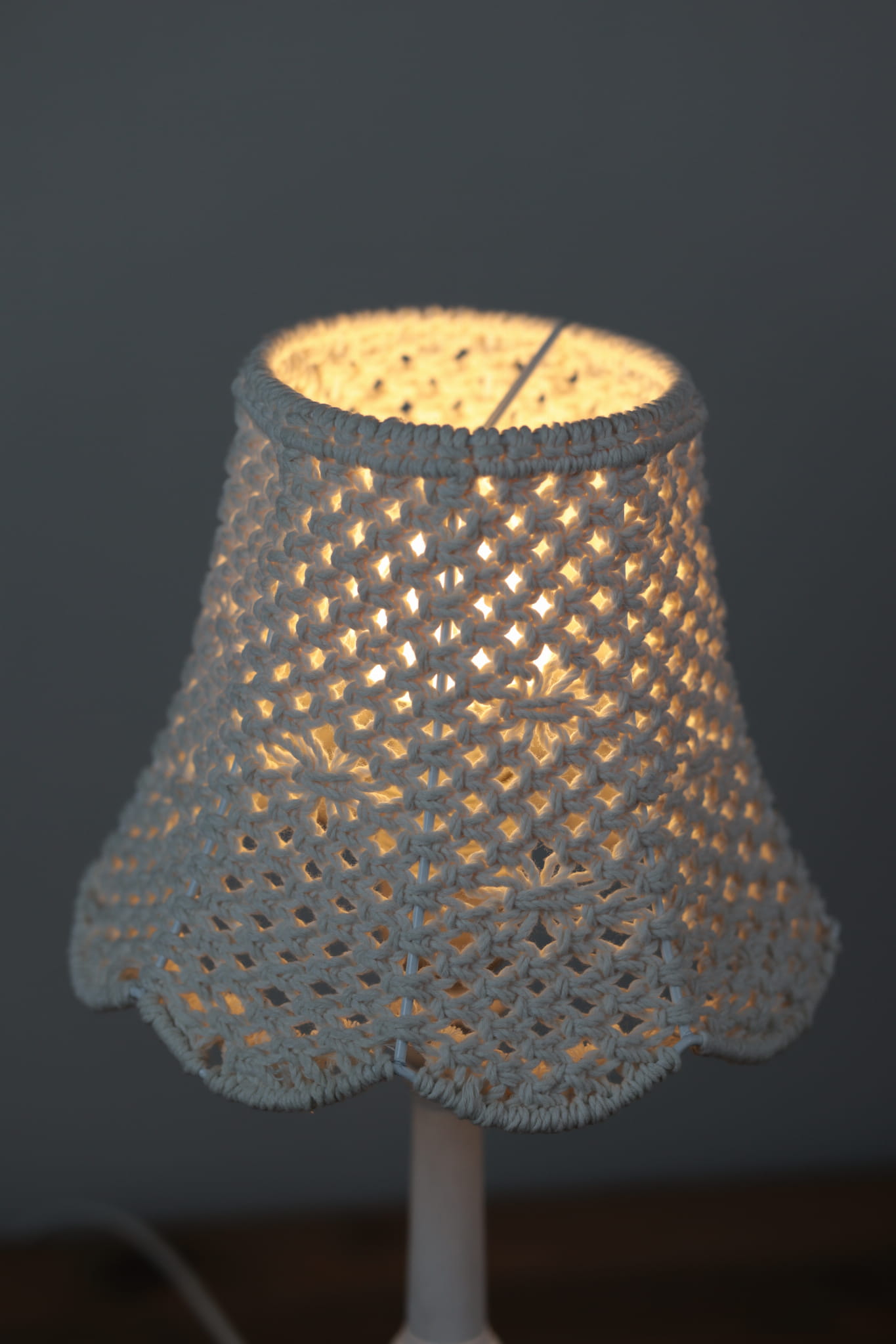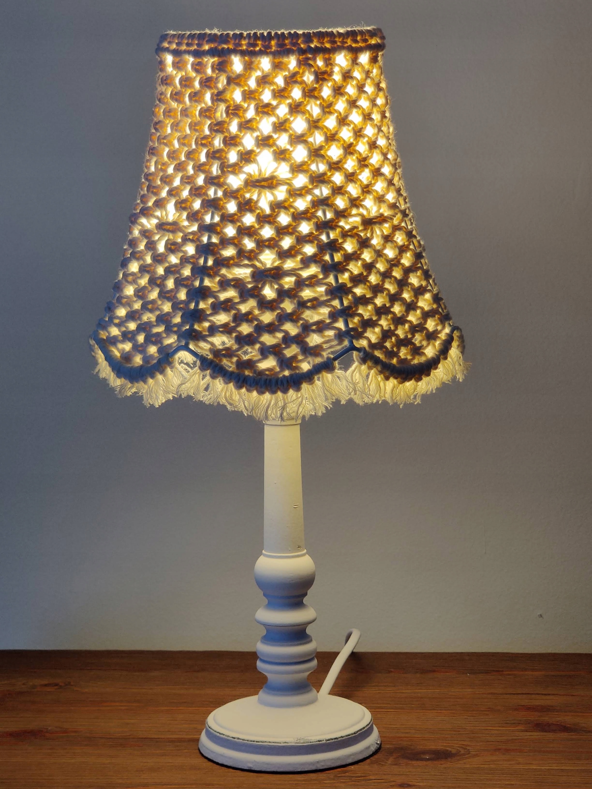 Abażur ∅20cm, wzór - siatka z diamentami) - wykonany techniką makramy (wyplatany ręcznie) ze sznurka bawełnianego potrójnie skręcanego 3PLY o grubości 3 mm (biały naturalny - ecru).