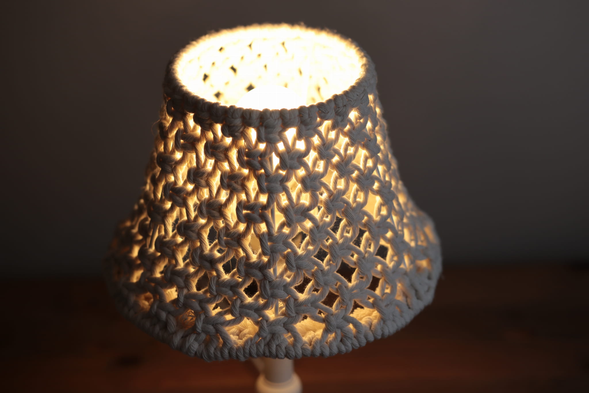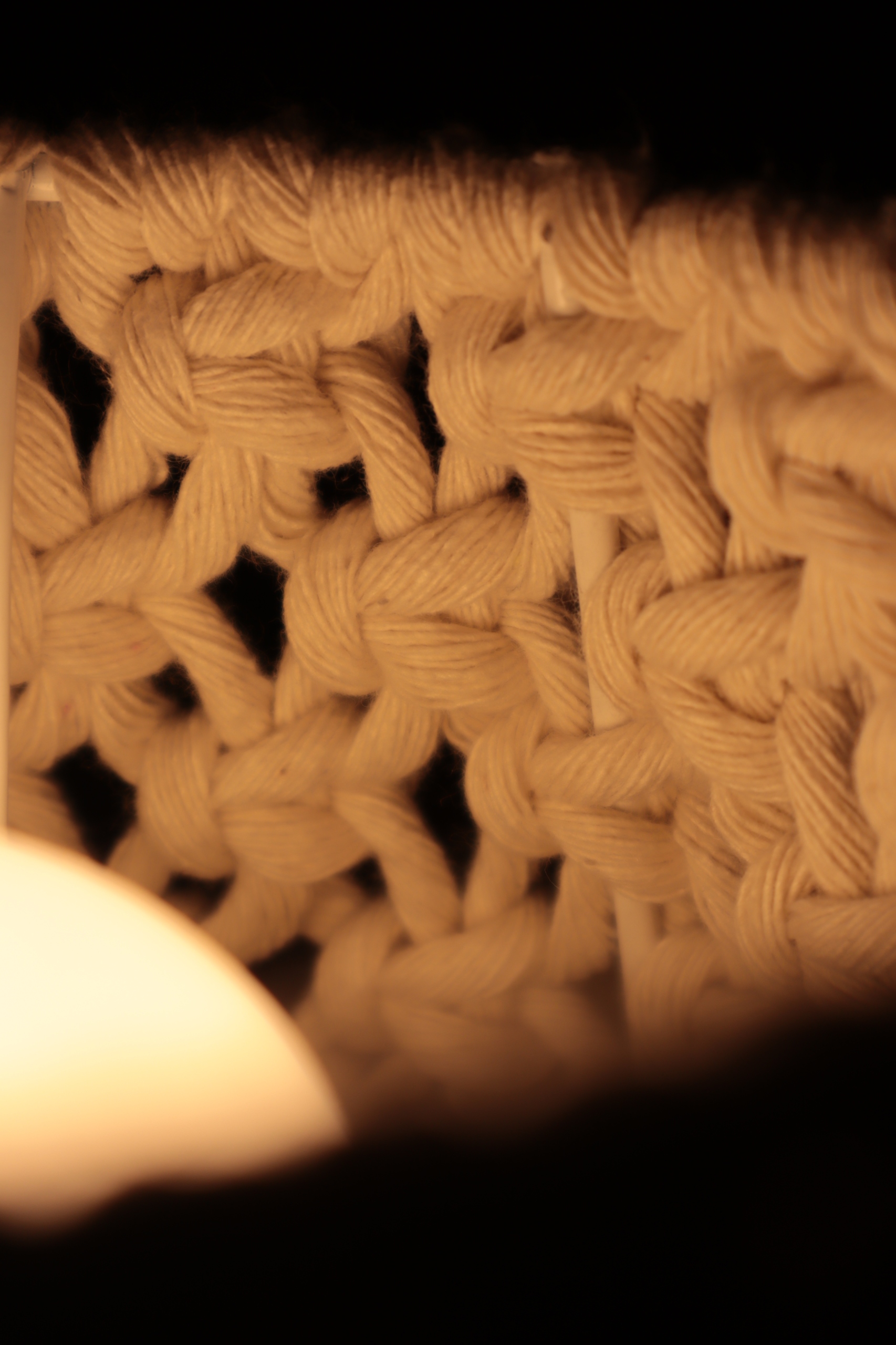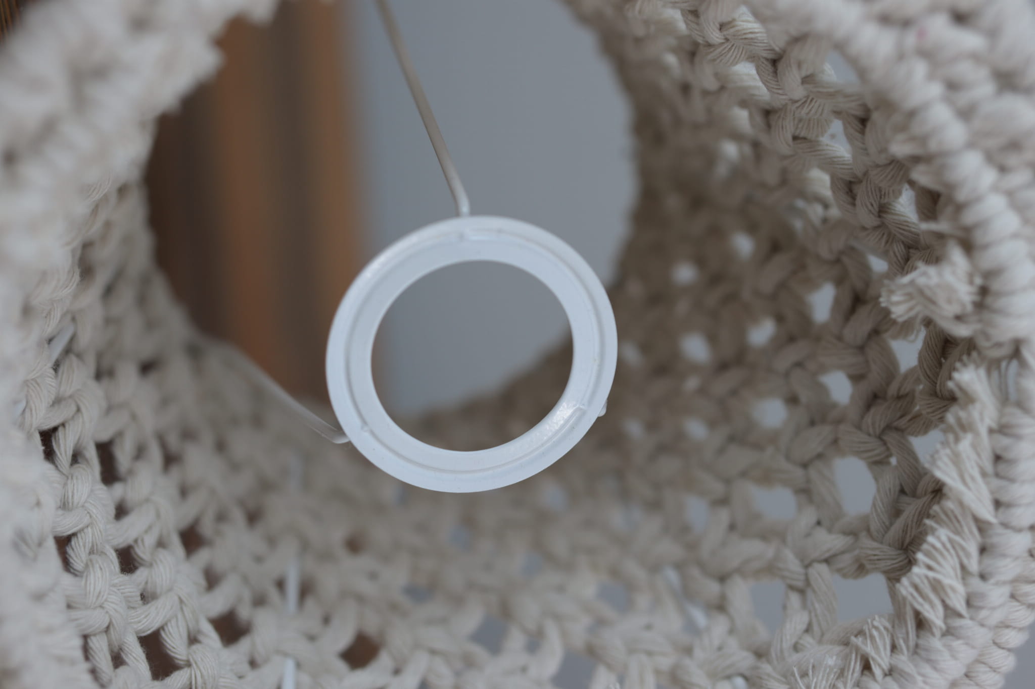Abażur ∅24cm (wzór płaski) - wykonany techniką makramy (wyplatany ręcznie) ze sznurka bawełnianego skręcanego pojedynczo o grubości 5mm w kolorze białym naturalnym - czyli ecru, off white.