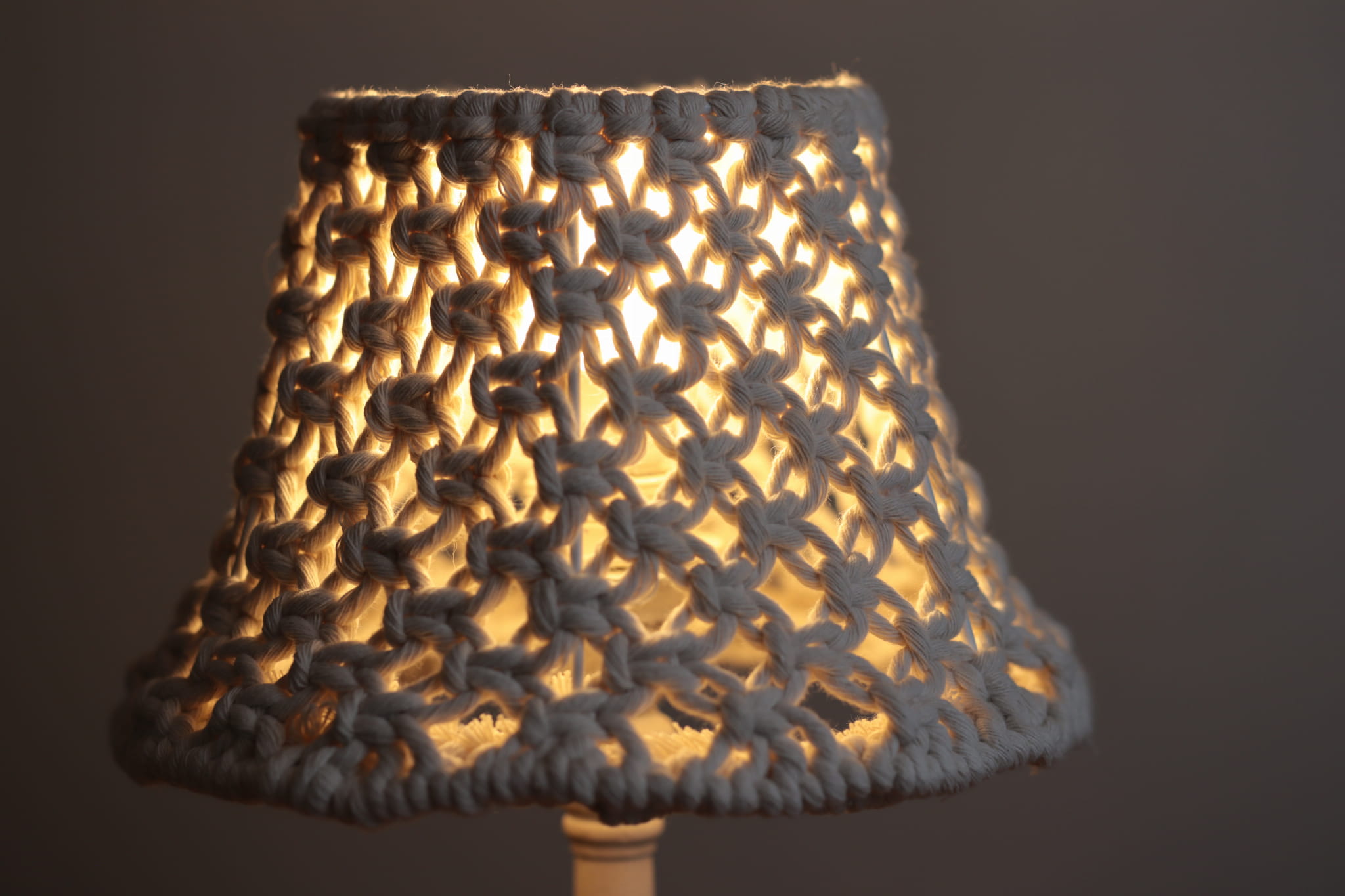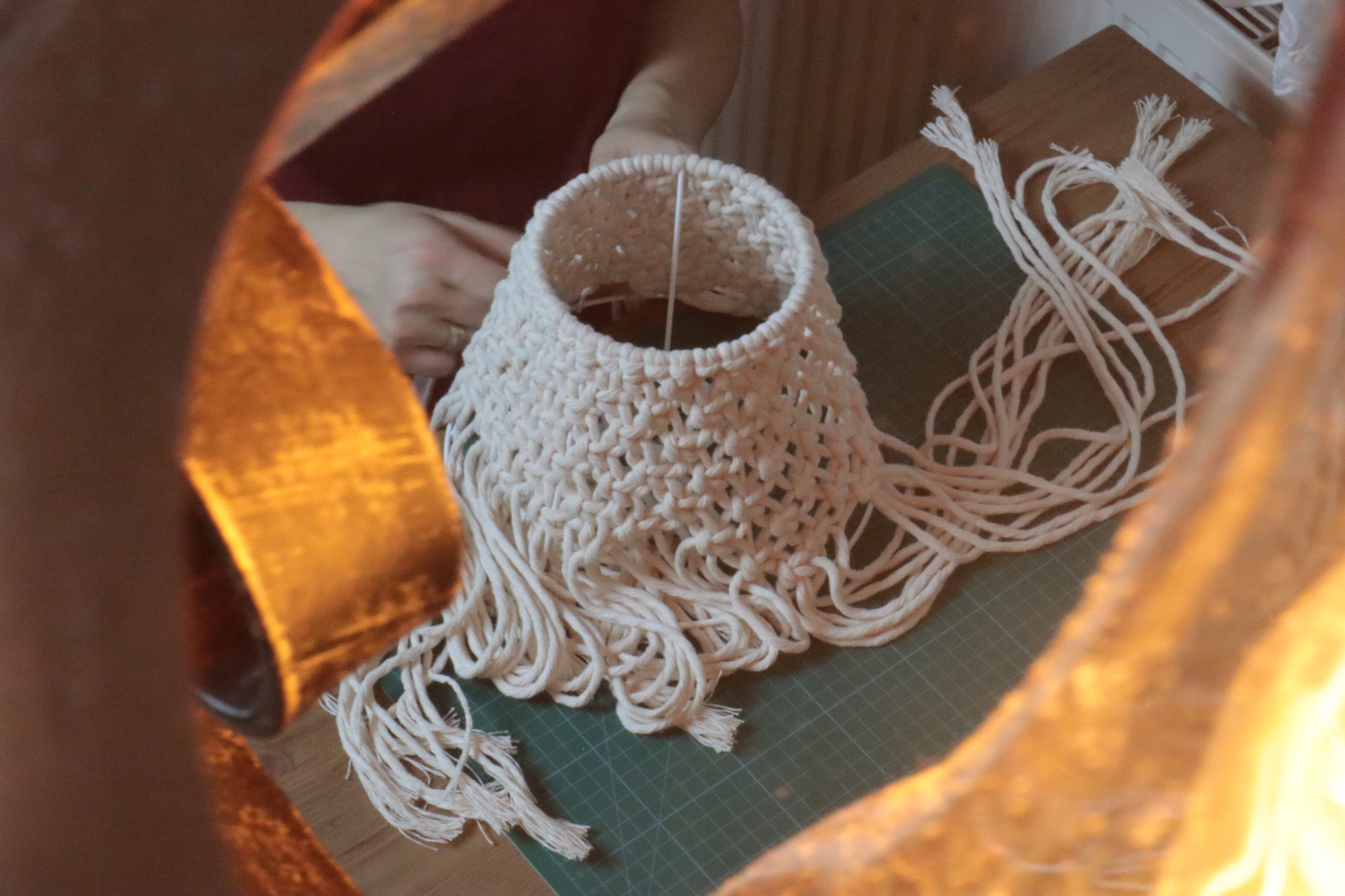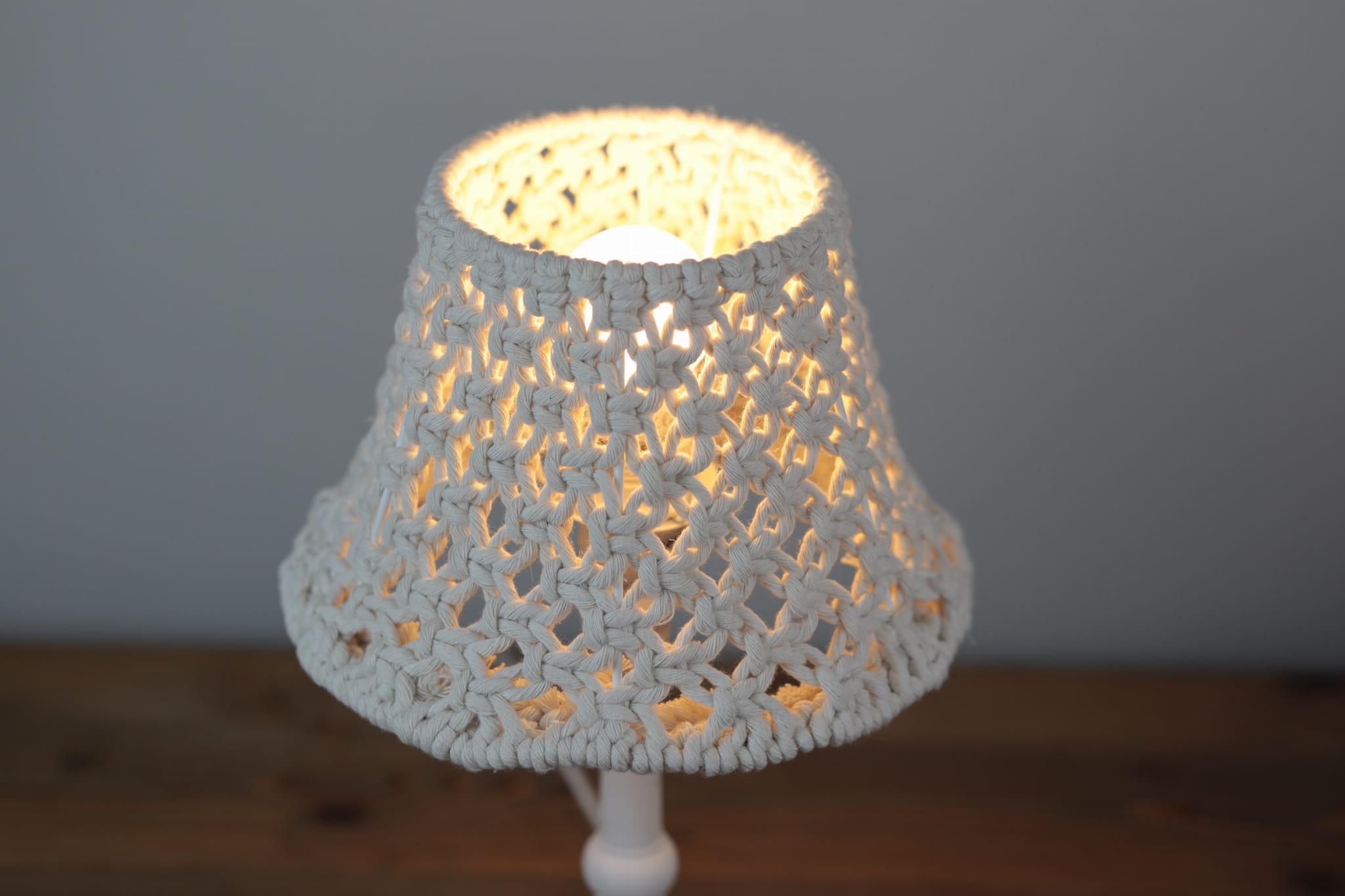 Abażur ∅24cm (wzór płaski) - wykonany techniką makramy (wyplatany ręcznie) ze sznurka bawełnianego skręcanego pojedynczo o grubości 5mm w kolorze białym naturalnym - czyli ecru, off white.