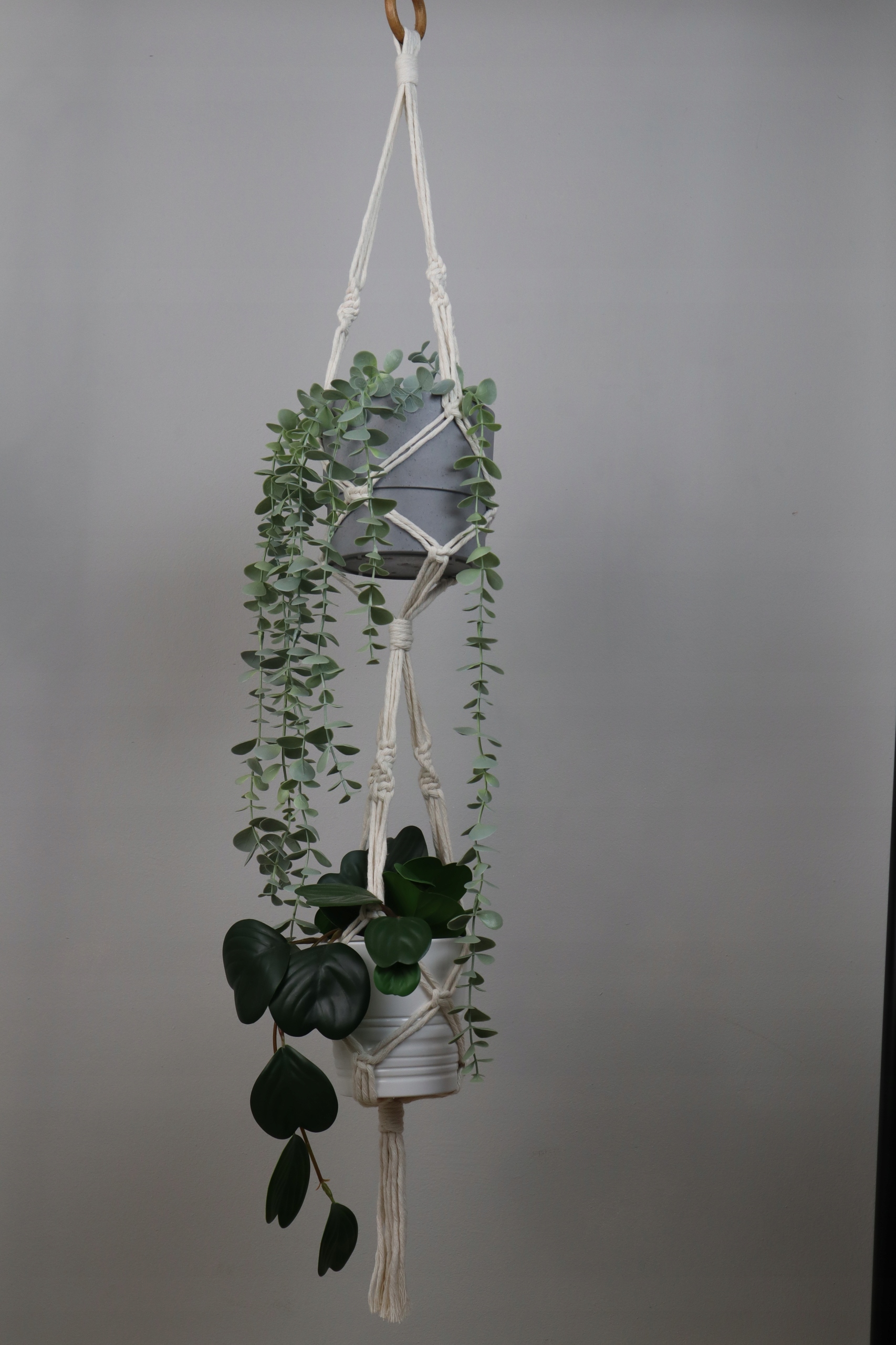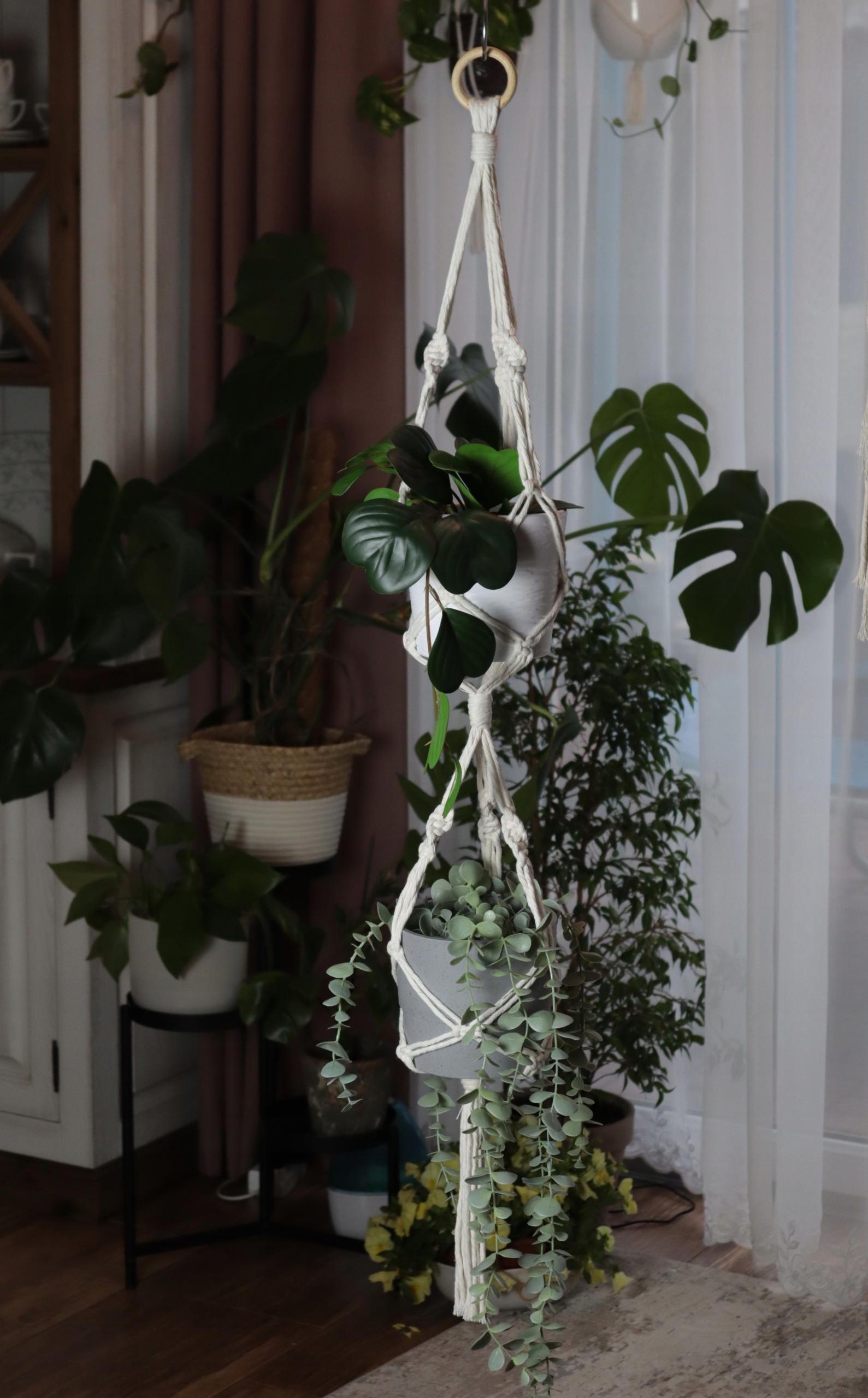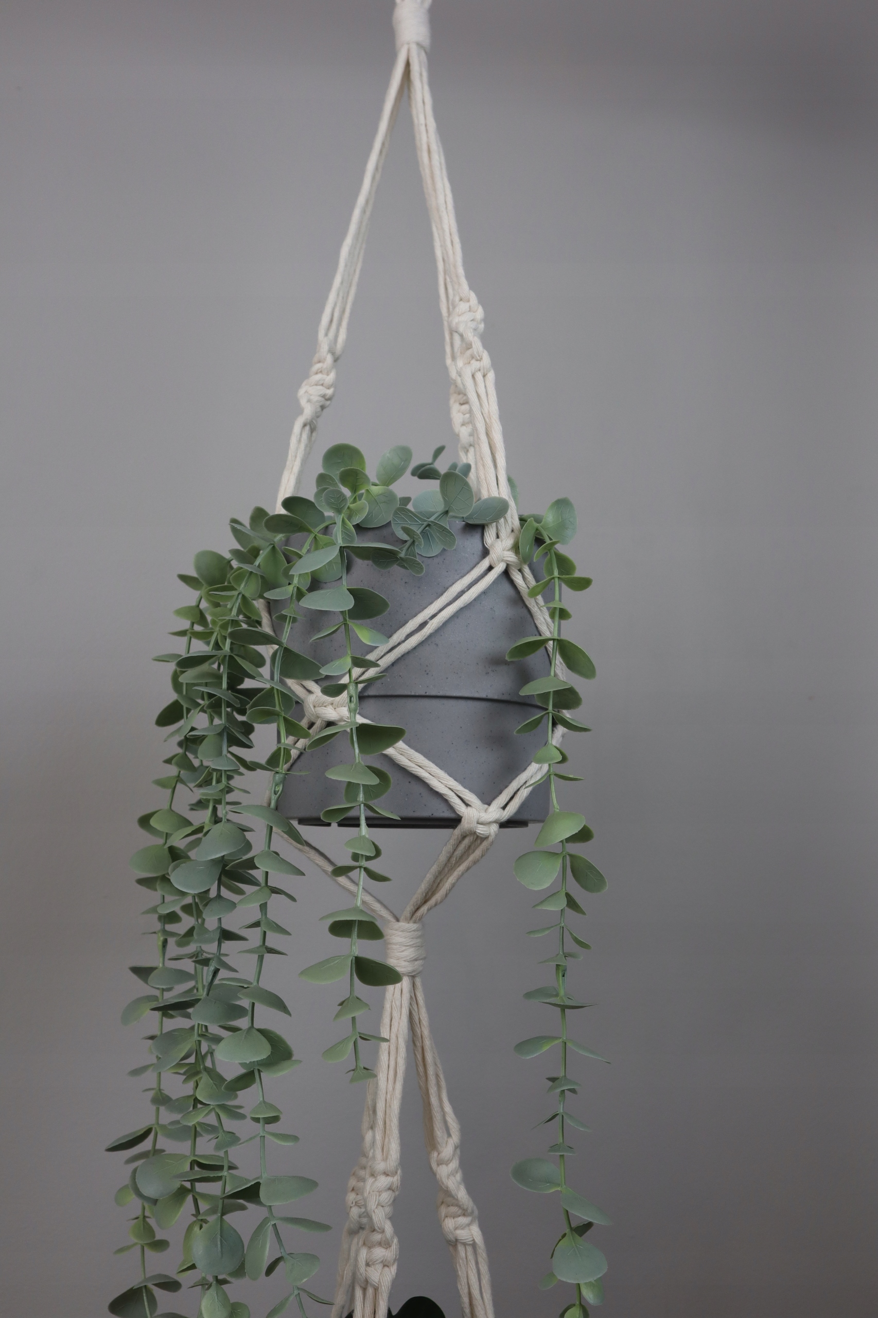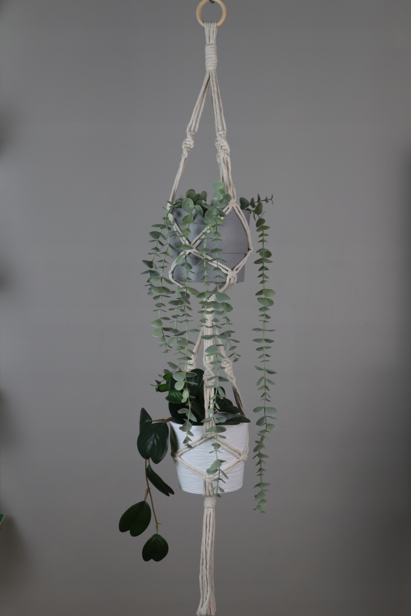 Kwietnik podwójny wykonany techniką makramy (wyplatany ręcznie) ze sznurka bawełnianego w kolorze białym lub naturalnym (ecru), skręcanego o grubości 5 mm.
