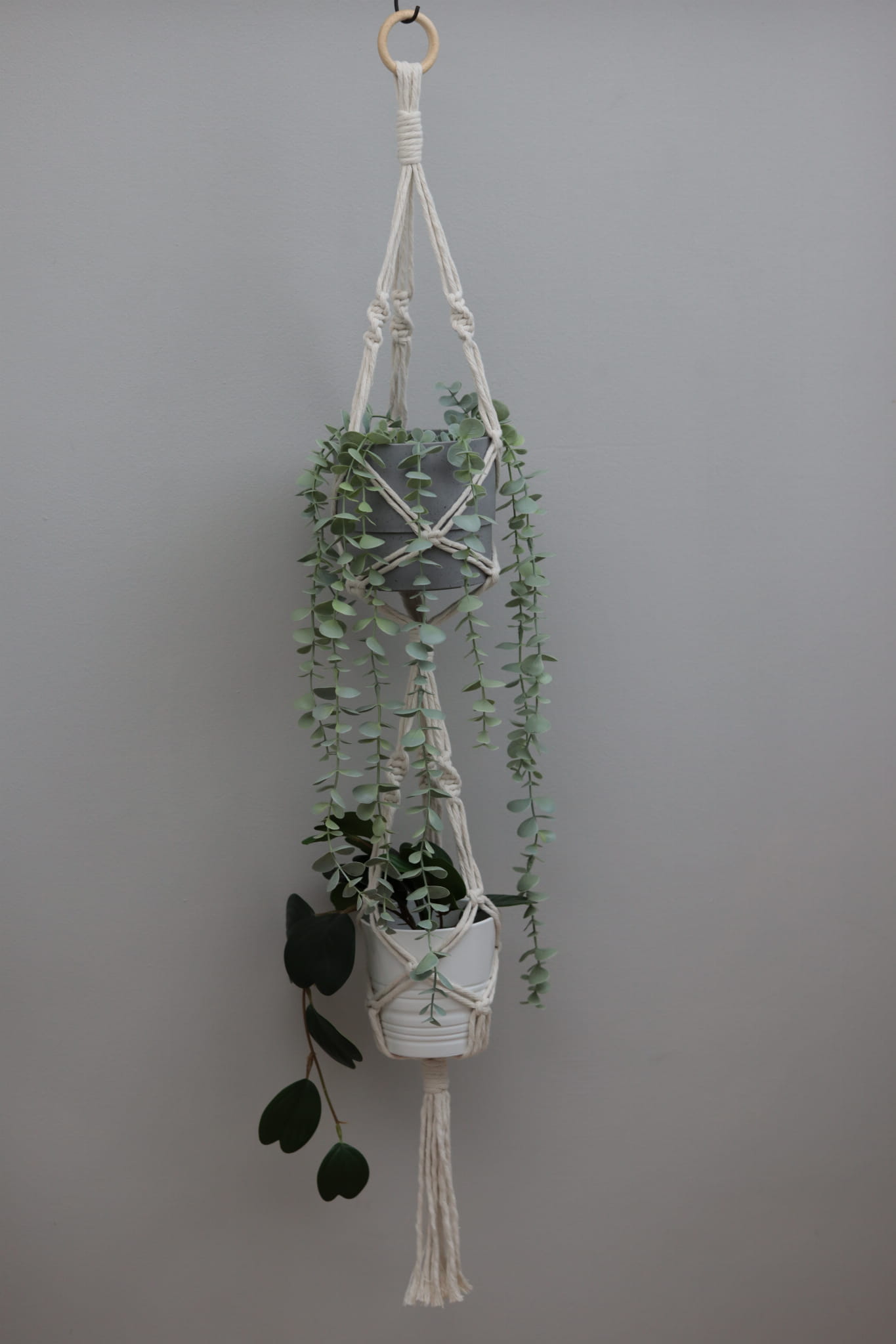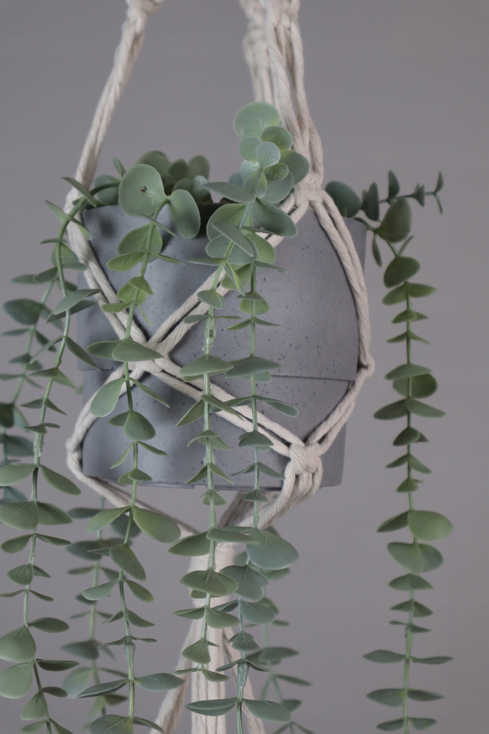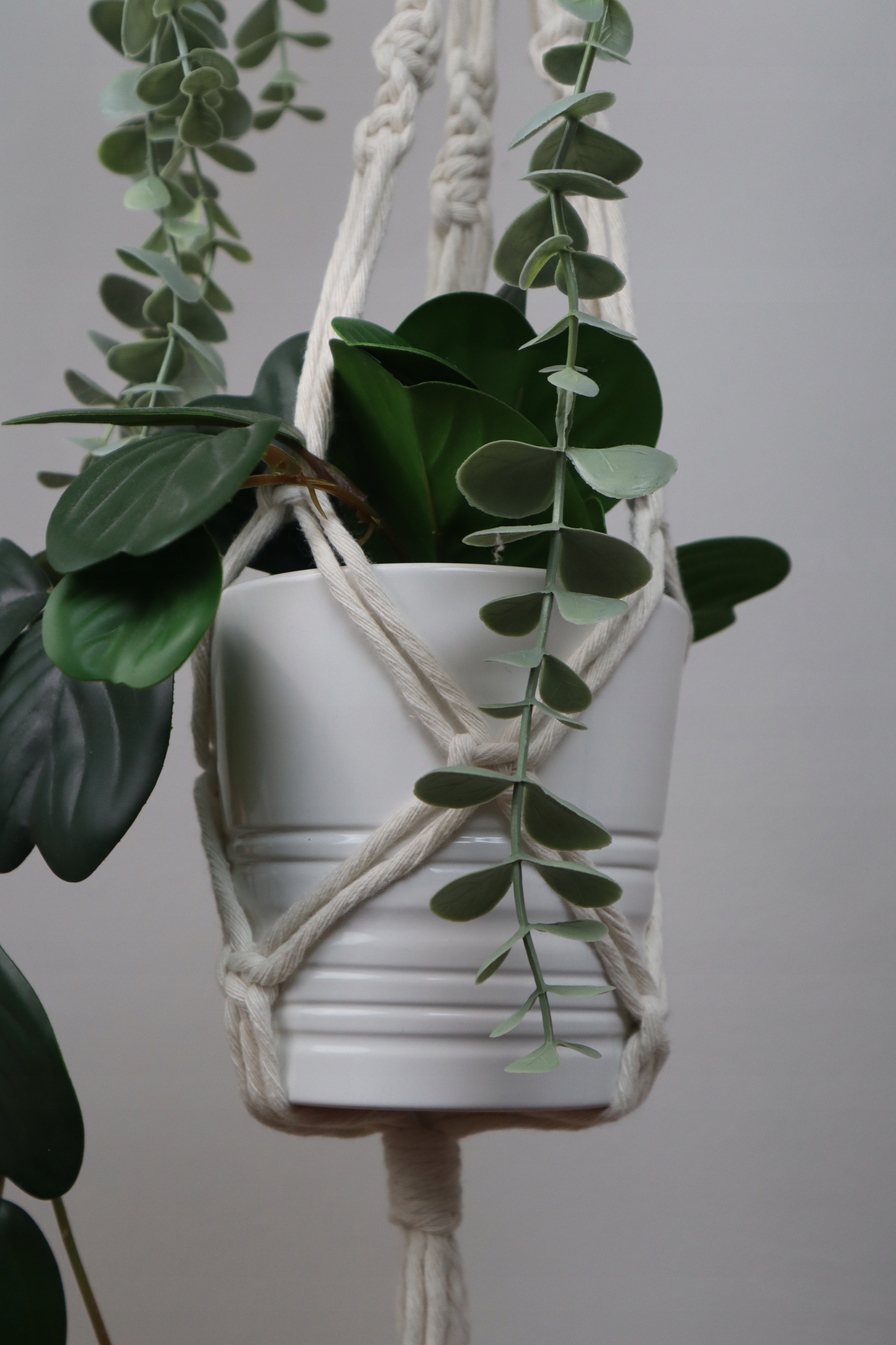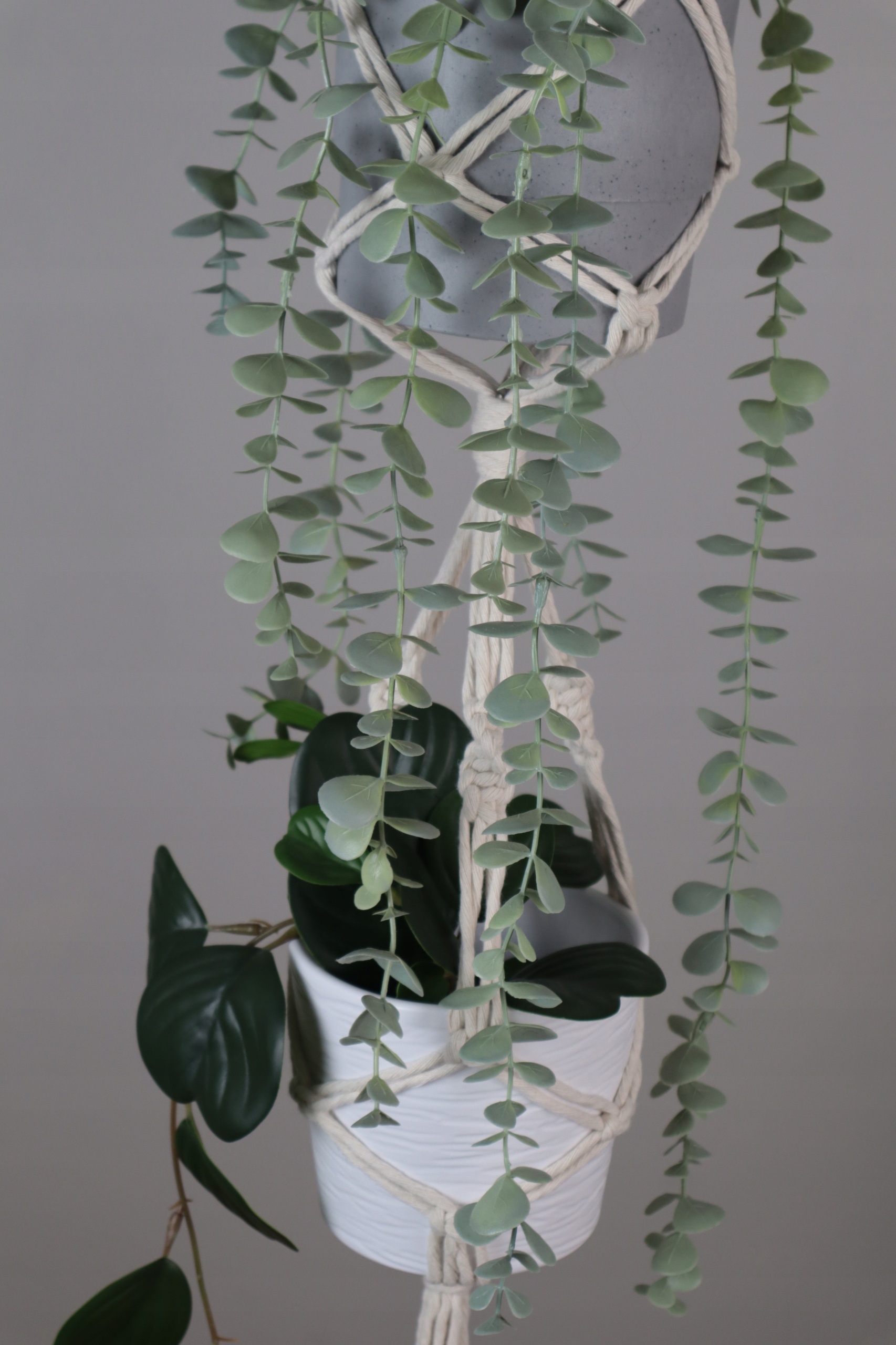Kwietnik podwójny wykonany techniką makramy (wyplatany ręcznie) ze sznurka bawełnianego w kolorze białym lub naturalnym (ecru), skręcanego o grubości 5 mm.
