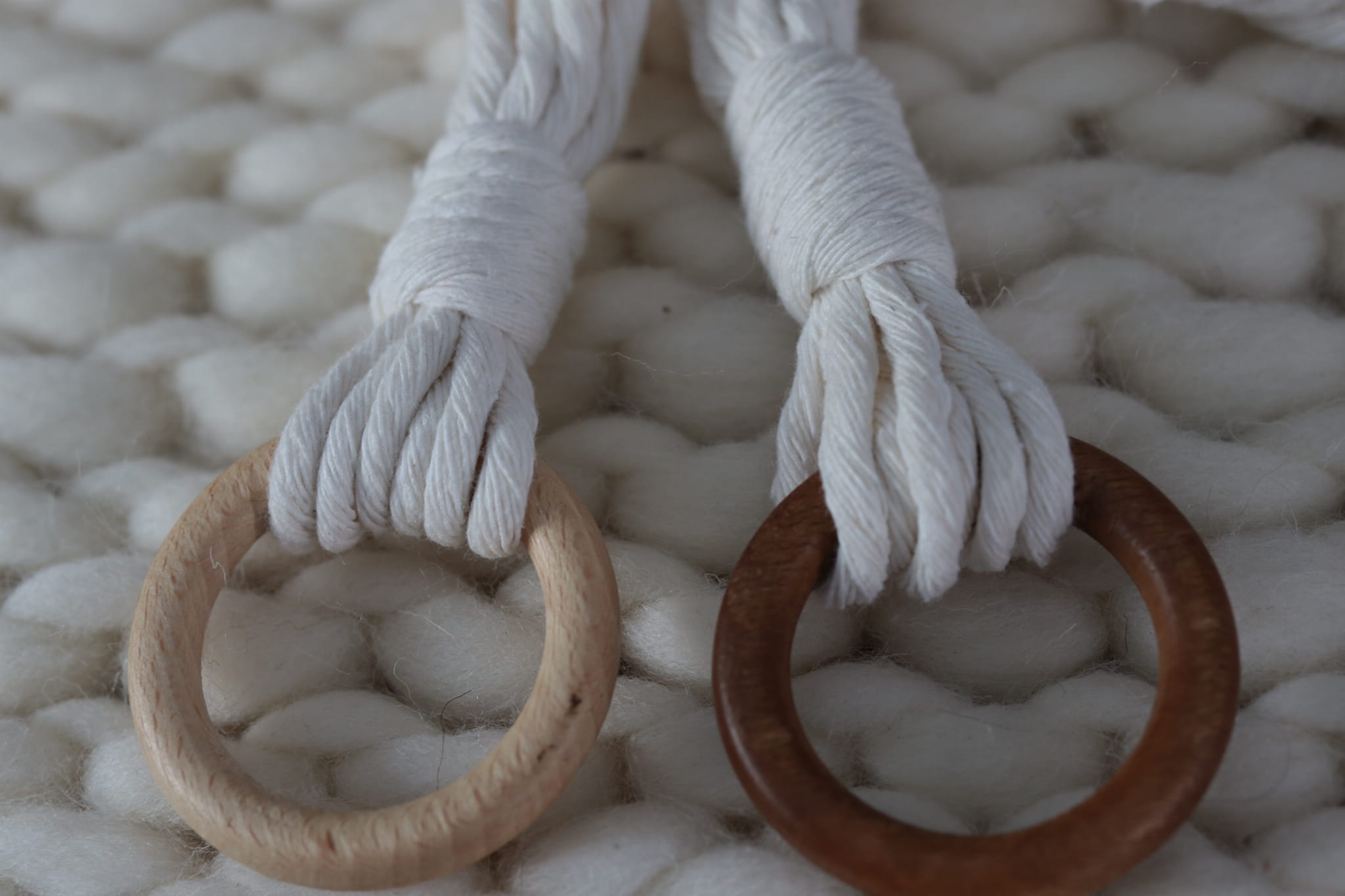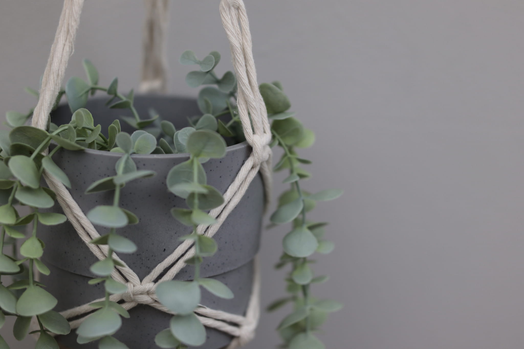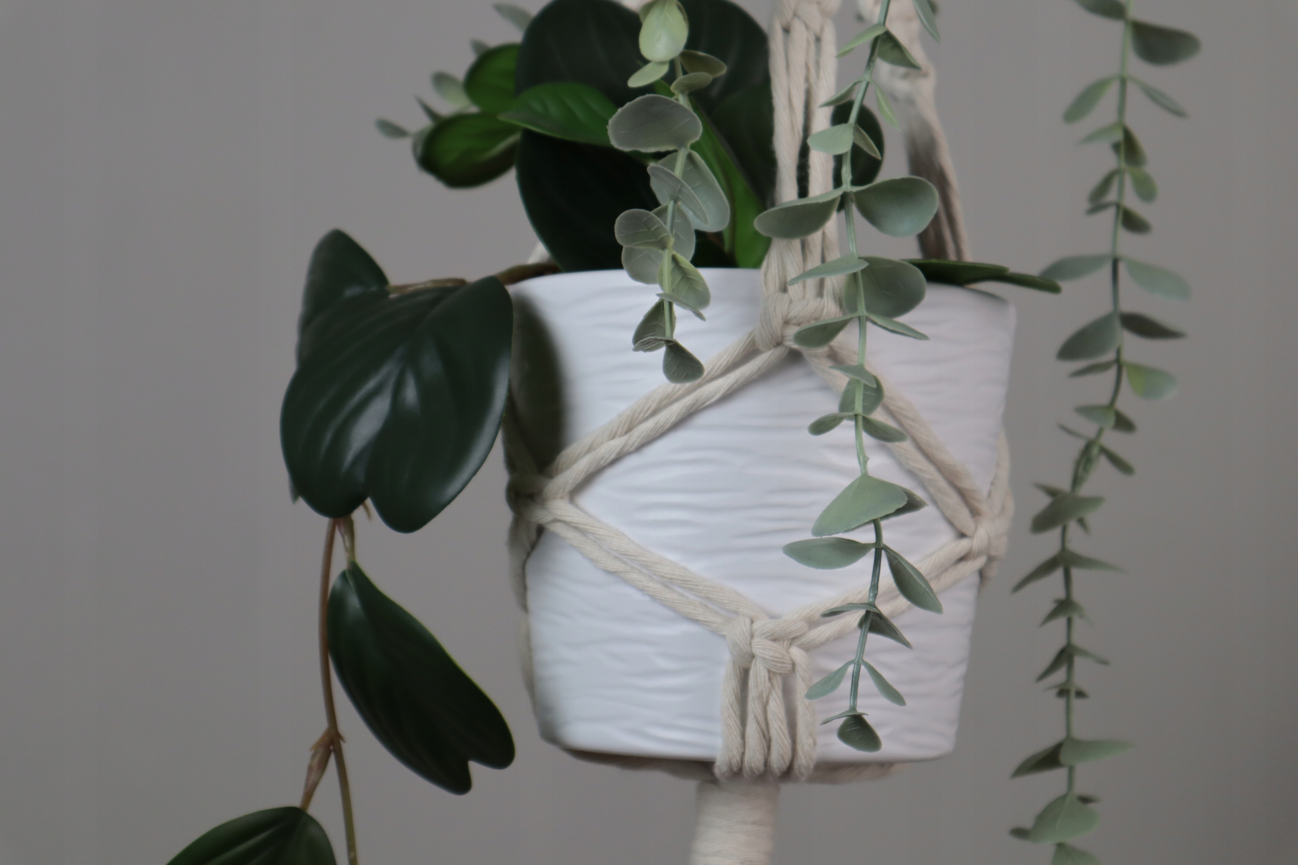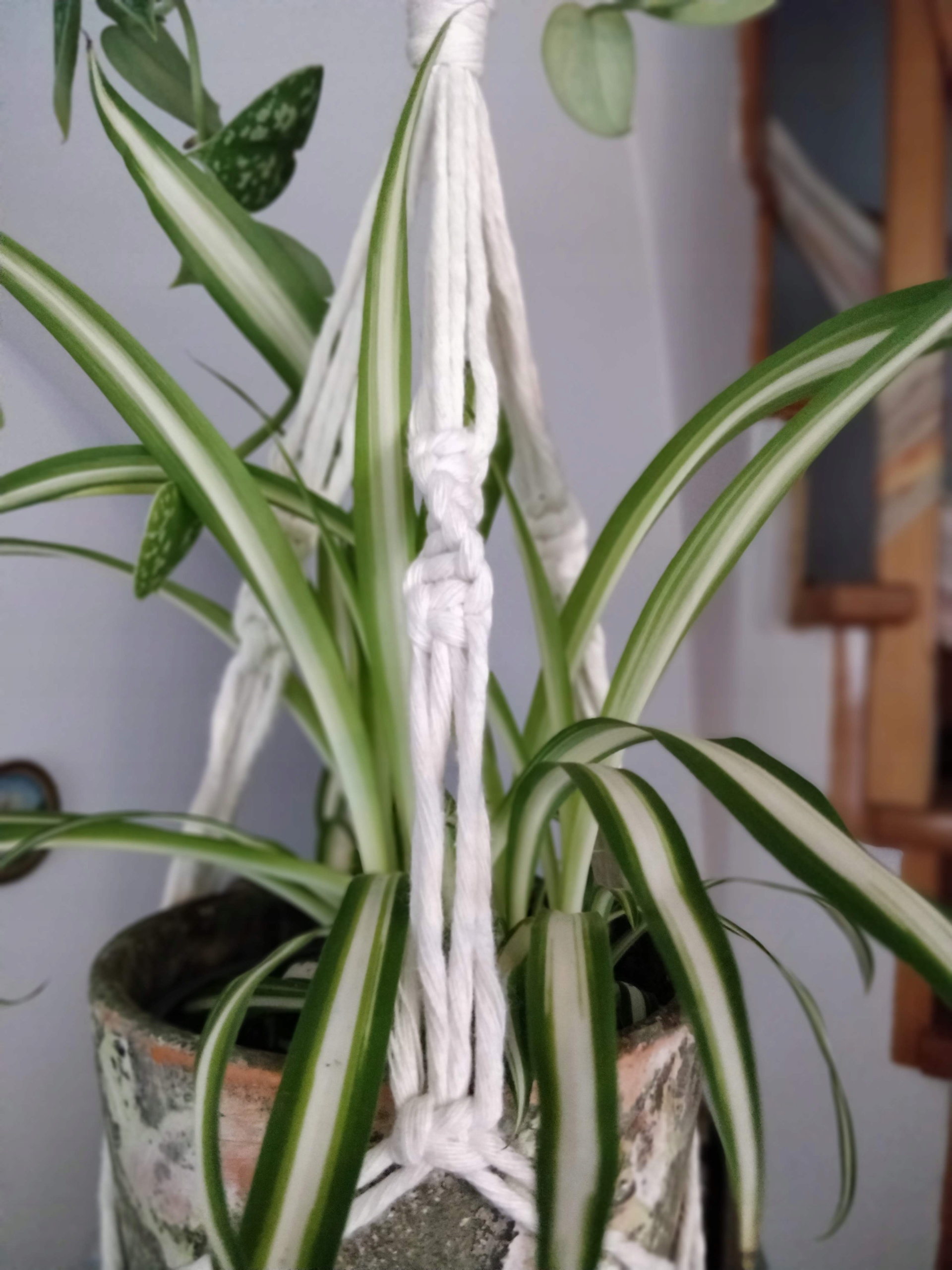 Kwietnik podwójny wykonany techniką makramy (wyplatany ręcznie) ze sznurka bawełnianego w kolorze białym lub naturalnym (ecru), skręcanego o grubości 5 mm.