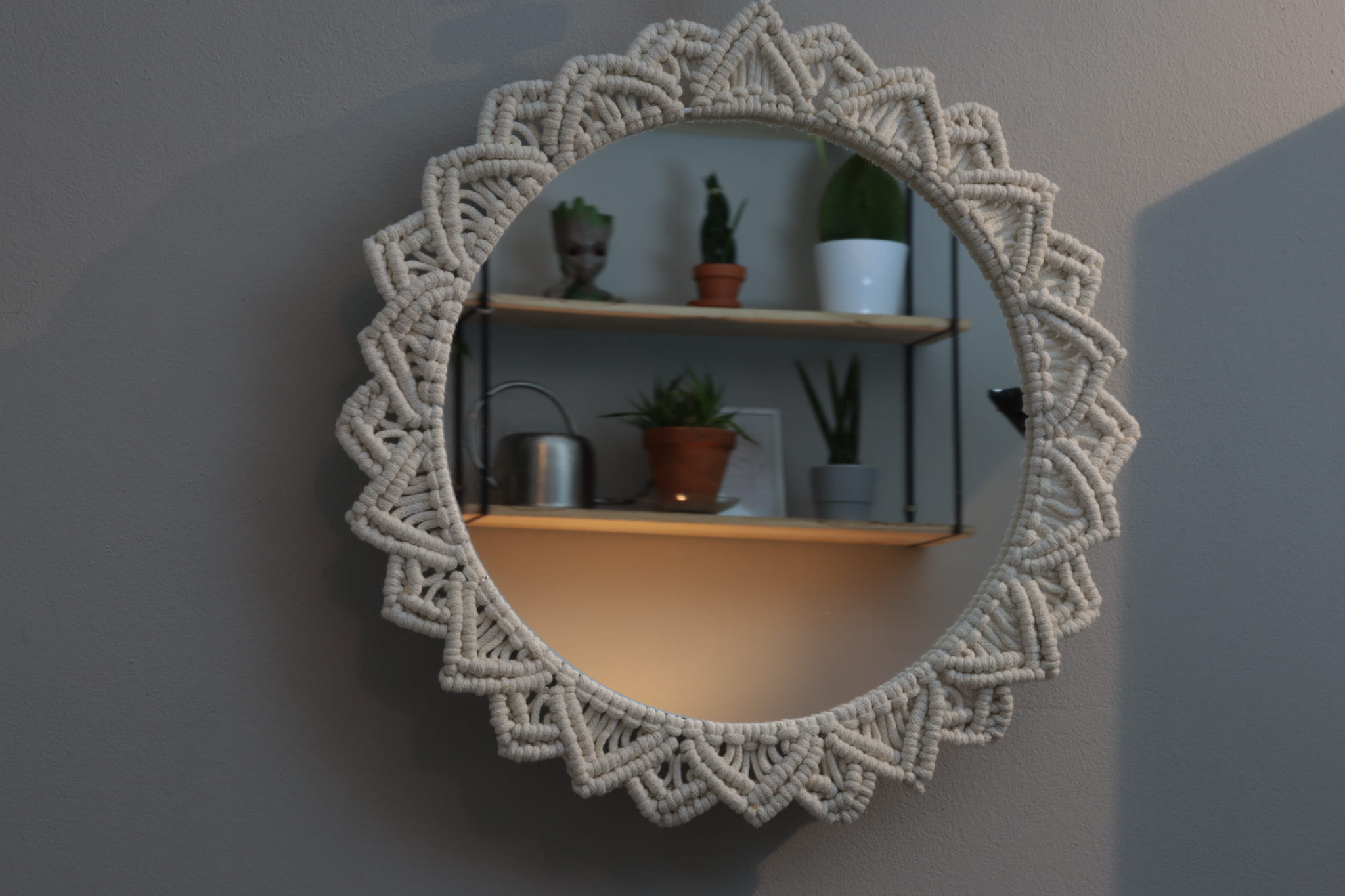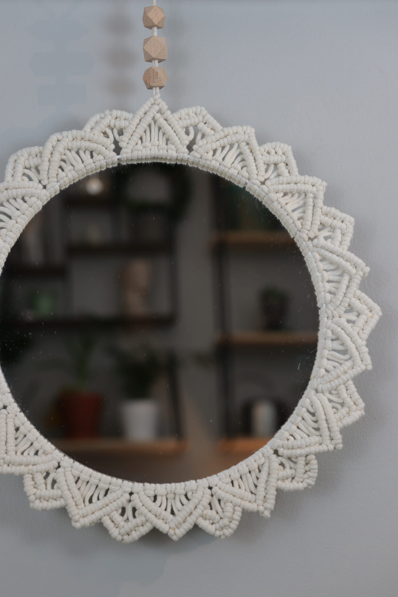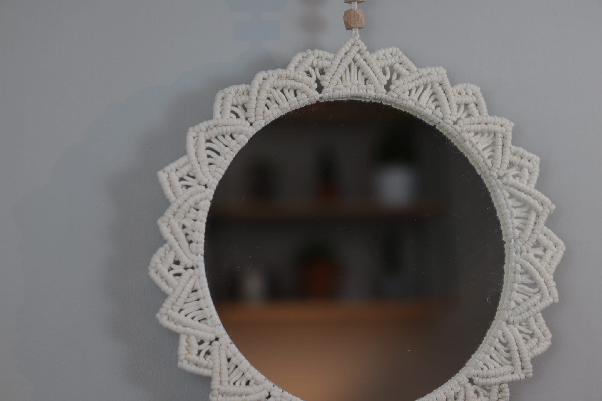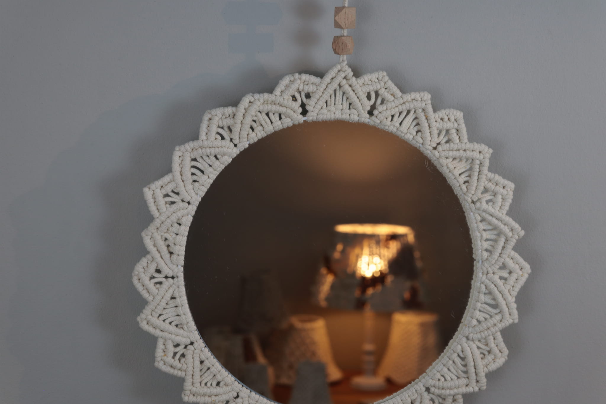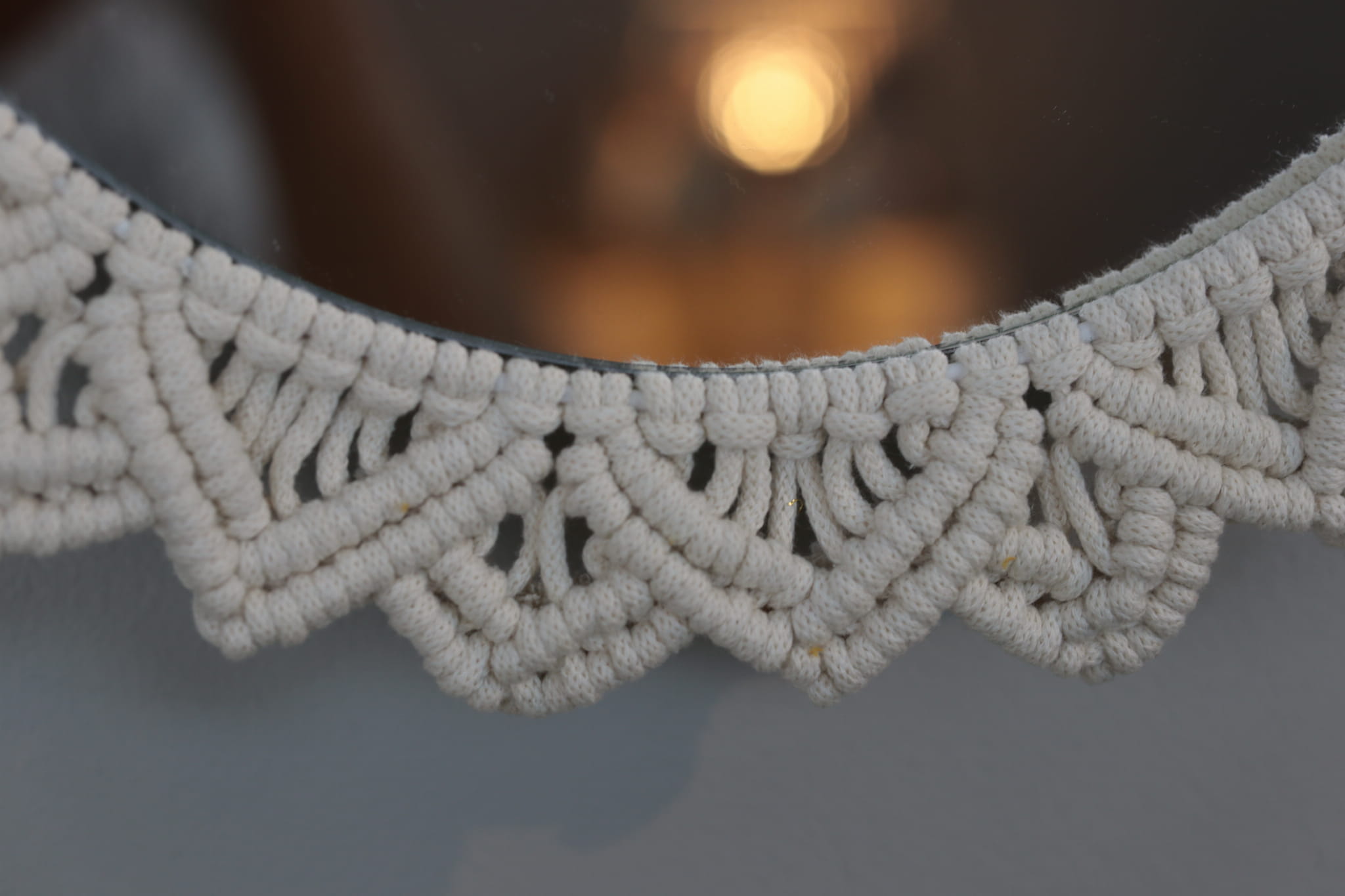 Ozdoba ścienna - LUSTRO MAKRAMOWE - wykonane ręcznie techniką makramy ze sznurka bawełnianego (polskiego producenta) w kolorze - naturalnym (ecru). To świetny dodatek w stylu boho do każdego wnętrza - salonu, sypialni, jadalni czy pokoju dziecka.