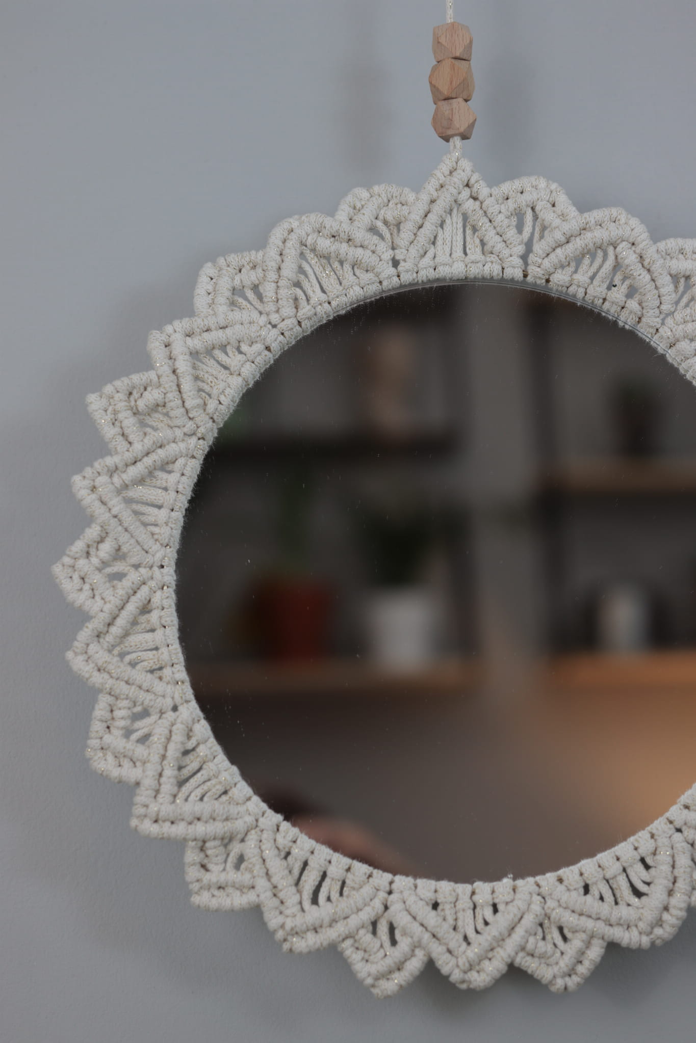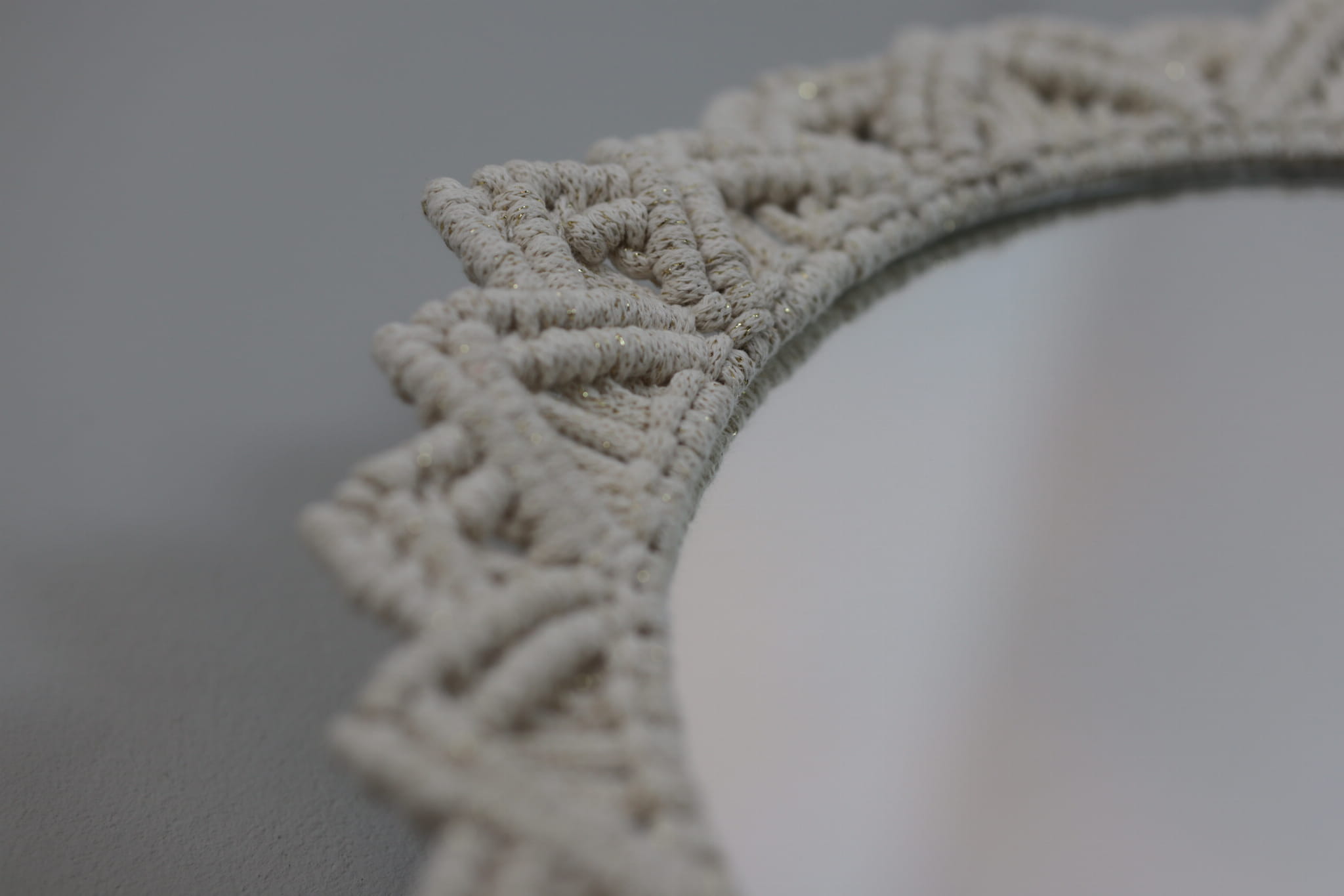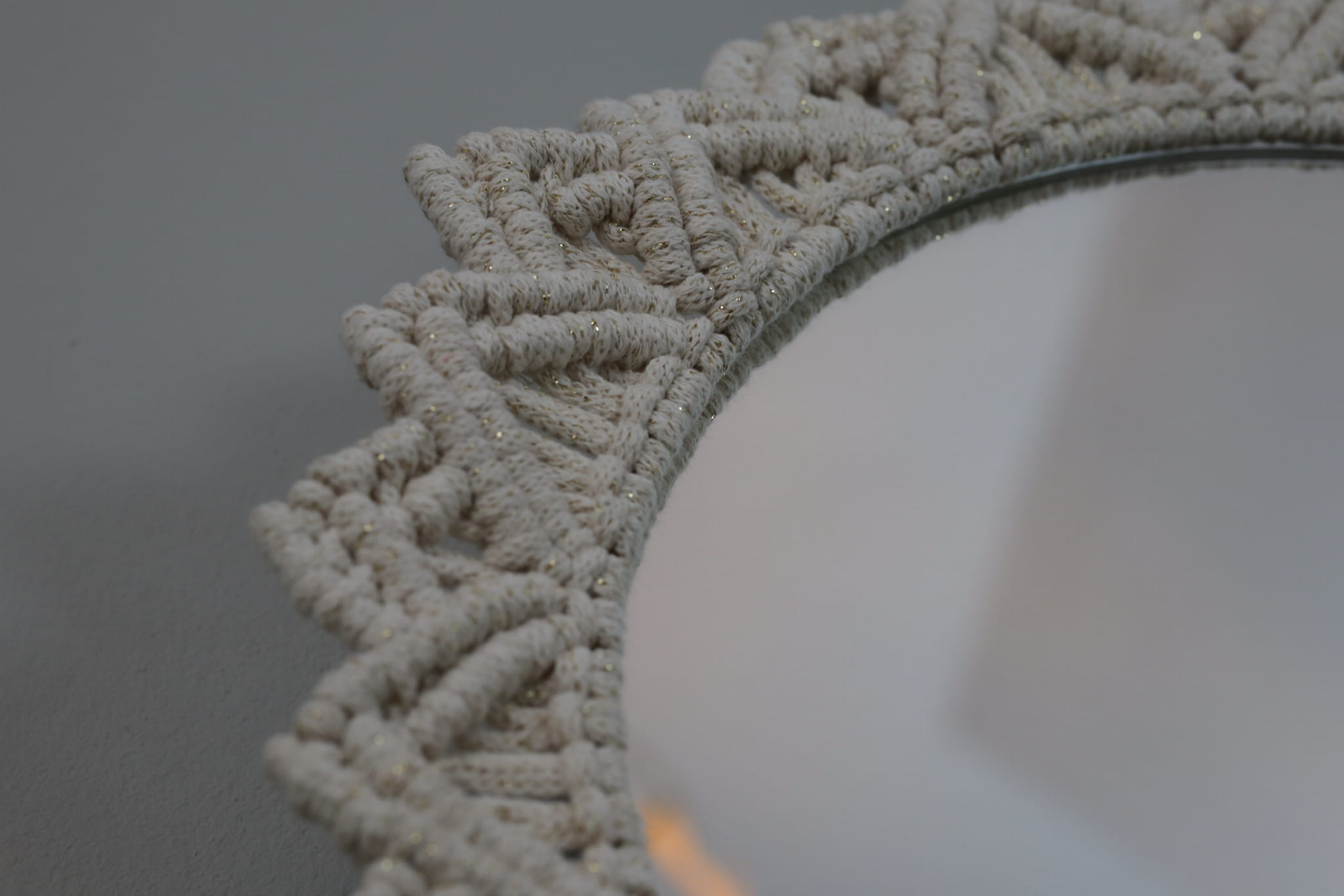 Ozdoba ścienna - LUSTRO MAKRAMOWE - wykonane ręcznie techniką makramy ze sznurka bawełnianego (polskiego producenta) w kolorze - naturalne złoto (kremowym ze złotą nitką). To świetny dodatek w stylu boho do każdego wnętrza - salonu, sypialni, jadalni czy pokoju dziecka.