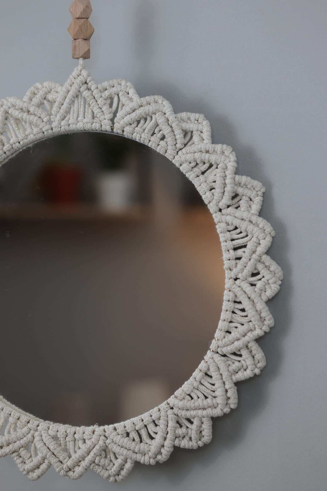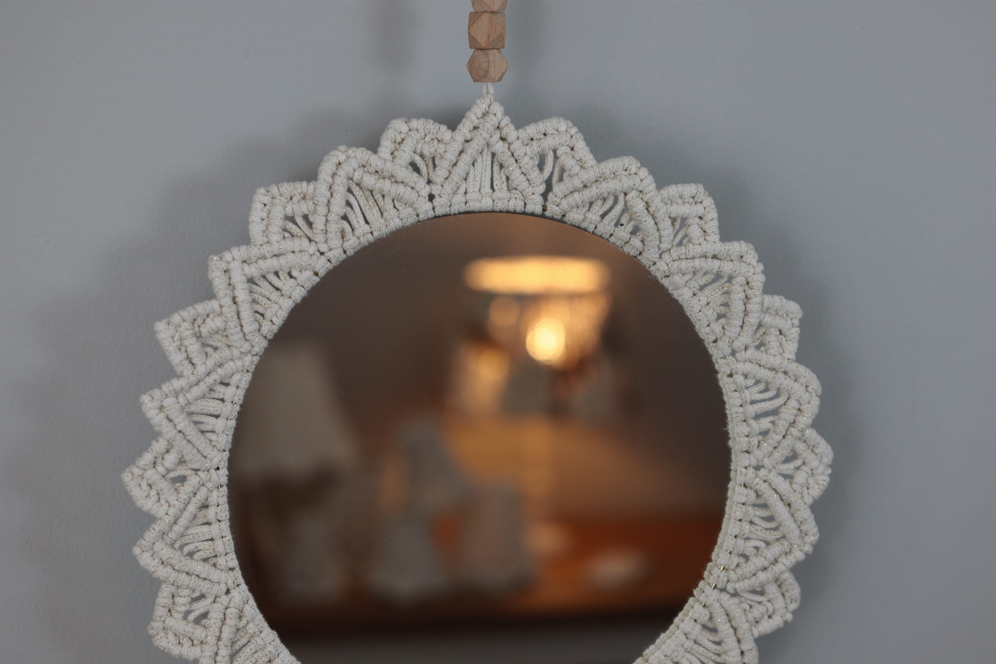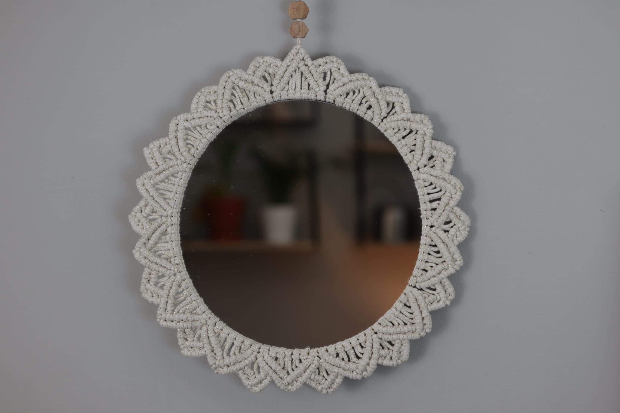 Ozdoba ścienna - LUSTRO MAKRAMOWE - wykonane ręcznie techniką makramy ze sznurka bawełnianego (polskiego producenta) w kolorze - naturalne złoto (kremowym ze złotą nitką). To świetny dodatek w stylu boho do każdego wnętrza - salonu, sypialni, jadalni czy pokoju dziecka.